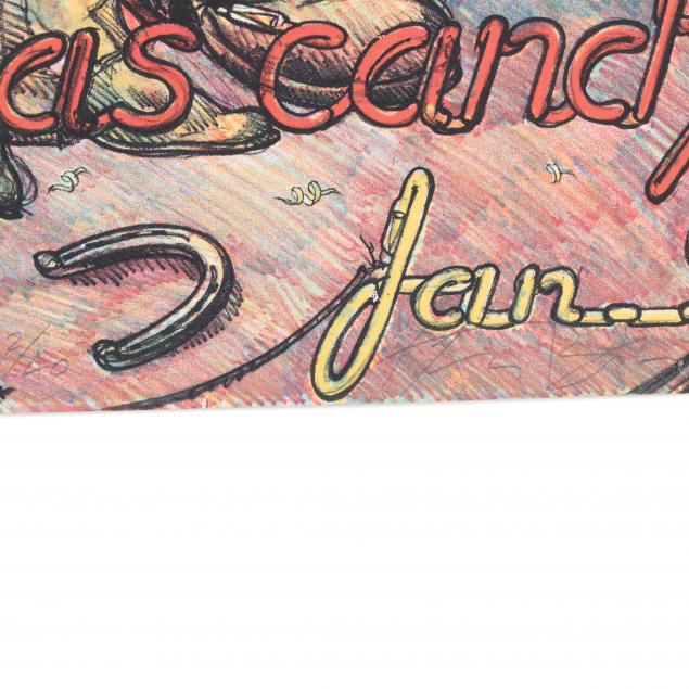 Jiménez frequently draws himself into these scenes in the form of a seductive woman, as seen here. This is a 1983 poster for an exhibition at Adeliza McHugh's "Candy Store Gallery" in Folsom, California, where Jiménez's art was presented alongside other artist's work from the Funk Art movement. Based on our research, this is the first time this lithograph has been offered at auction.