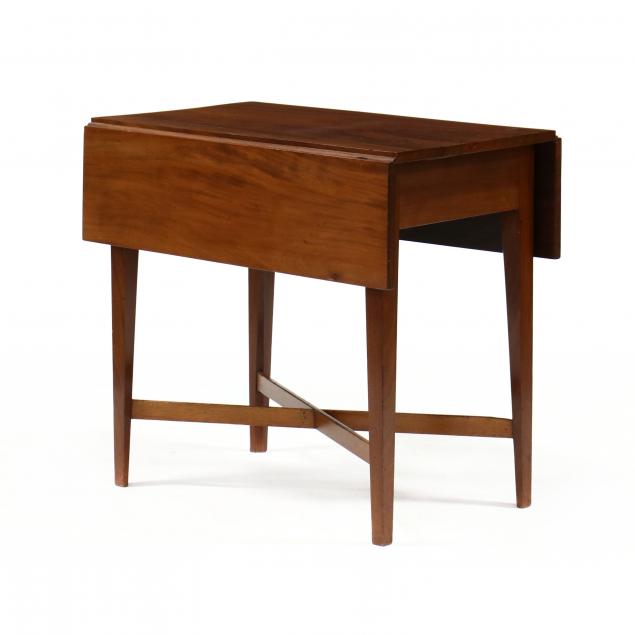 Circa 1800, poplar secondary, rectangular top and drop leaves featuring high-grade Santa Domingo mahogany, each leaf with single butterfly support, single flush mount drawer with scratch bead, raised on tall square tapered legs with inside chamfer, 'X' stretcher base.
