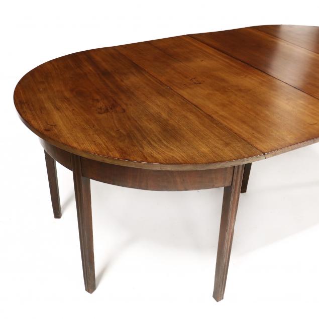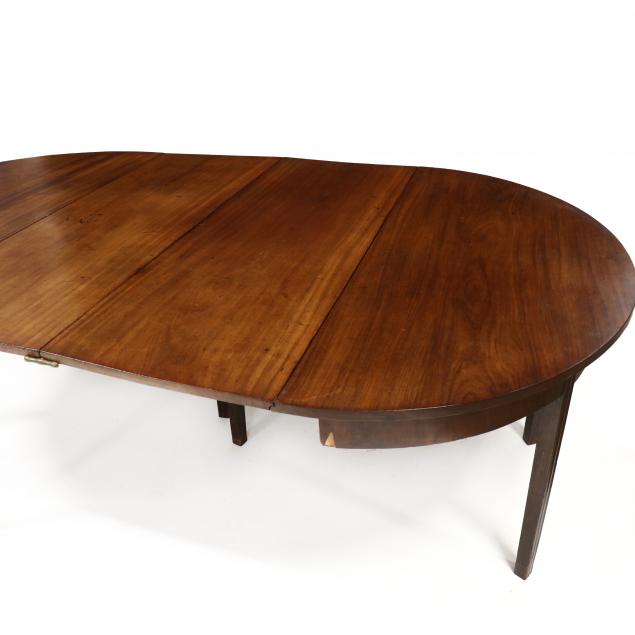 Circa 1800, mahogany veneer, white pine secondary, two drop leaf 'D' ends coming together to form an oval dining table, each 'D' end with gate-leg drop leaf support, nice over-hang to skirt edge, vertically veneered skirt, molded straight tapered legs.