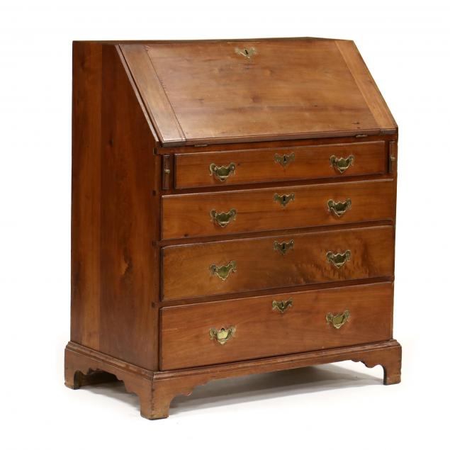 From the Collection of Mr. & Mrs. James Ross Johnson, Jr., Charlotte, North Carolina Cut, patch and repair to top and lid by escutcheon; cut, patch and repair at hinges to lid; staining and wear to interior writing surface; missing three valances; drawer runners rebuilt; later pulls; missing two locks and key; one pull missing post and bail; left and front feet facings original, right side foot facing later.
