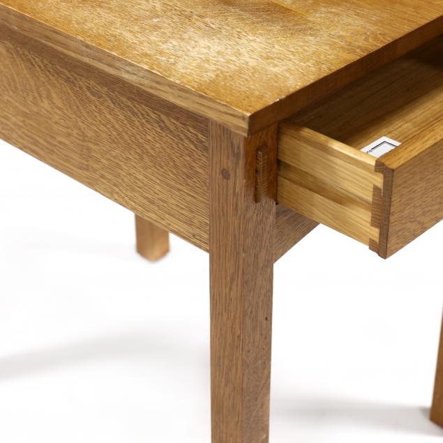 Contemporary production, quarter swan oak in the Fayetteville finish, single flush drawer, hammered copper pull, through tenon construction on straight legs, labeled.