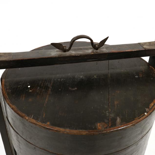 Late 19th century, black lacquered hardwood consisting of five stacking parts within a wood and metal frame with bail handle, character marks to outer lacquer decoration.