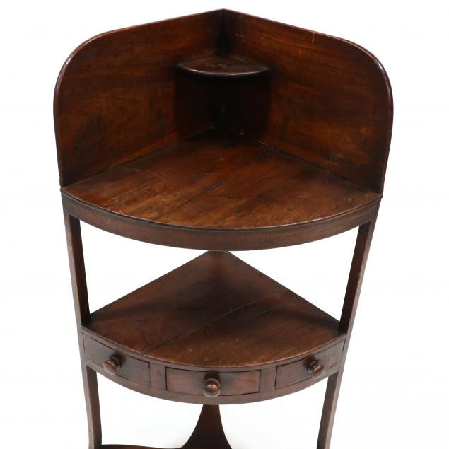 Circa 1800, mahogany and pine secondary, bow-front form, top with tall dovetailed backsplash with small upper shelf, lower shelf with single center drawer flanked by two faux drawers, shaped stretcher on down-swept feet.