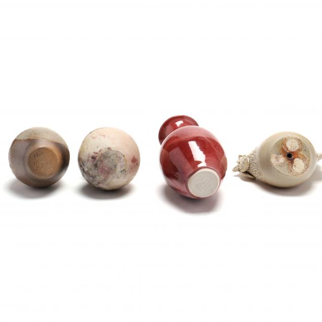 To include: a salt glazed chicken; a salt glazed vase (5 3/ in.); a matte glaze vase with firing mistake; a reddish glazed baluster vase (7 3/4 in.) all inscribed with signature and date on the underside.
