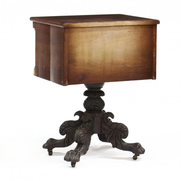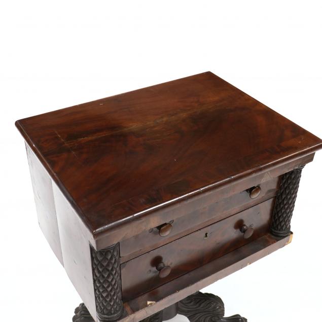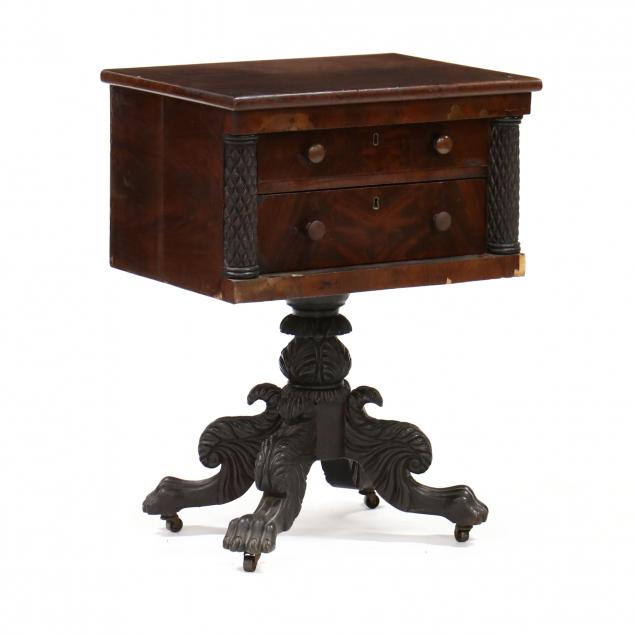 Circa 1830, mahogany veneer, poplar secondary, top with banded front edge and applied rounded trim, two graduated flush drawers with figured mahogany veneers flanked by diamond carved half columns, flush sides, acanthus carved urn pedestal on four acanthus carved legs with paw feet on casters.