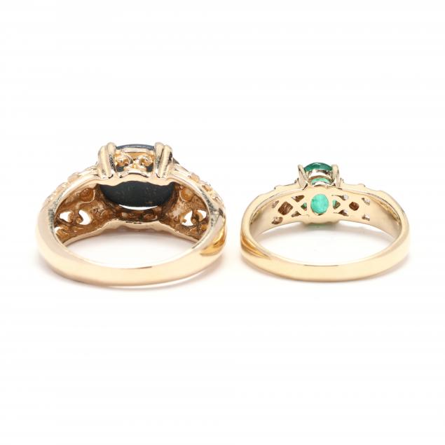 To include: a yellow gold ring with central prong set oval cabochon star sapphire (10.3 x 8.2 mm) with two round brilliant cut white sapphire accents, shoulders and gallery with scroll decoration, stamped 10K (ring size 6.5); a yellow gold ring with central prong set oval cut emerald (7.1 x 5.15 mm) weighing approximately .78 carat, with channel set princess and baguette cut diamonds weighing approximately .28 total carats (I-J color, SI-I clarity), stamped 14K RI and with maker's mark G (ring size 5.75).