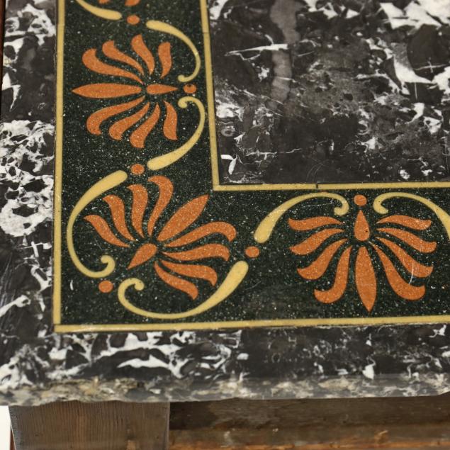 19th century, inset marble top with inlaid marble surround, canted corners, mahogany veneer frieze with applied ormolu mounts, painted composition dragon form supports, rear panel with mirror, lower shelf, reeded conforming stacked feet.