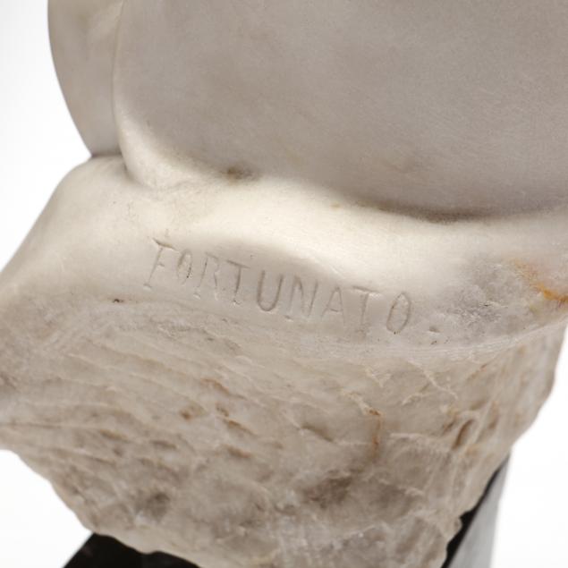Italian, late 19th century, carved white marble, carved signature "FORTUNATO" to left shoulder, rod mounted on a black hardstone base with cemented core.