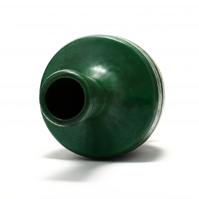 Matte green with embossed diamond banding below the angular shoulder, marked by hand underglaze on the underside, "RADURA".
