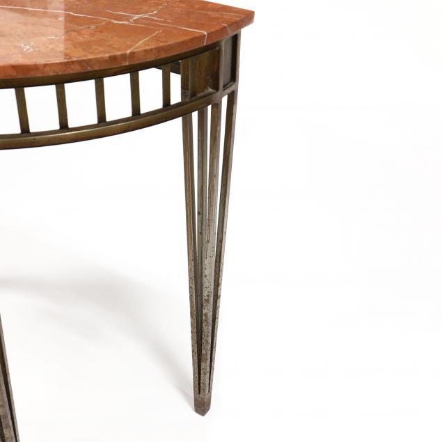 Late 20th century, demilune form, salmon marble top, patinated steel base, unmarked.