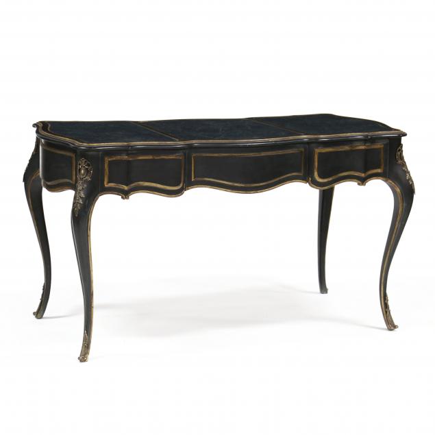 Circa 1980, serpentine form, faux marble laminate top, painted and gilt wood case, the front with three drawers, finished on all sides, raised on cabriole legs with ormolu mounts.