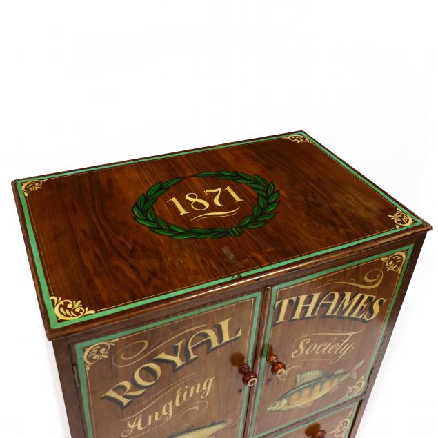 Mid 20th century walnut veneered cabinet with later fish themed paint decoration, two hinged cabinet doors with open interior over two drawers on shaped bracket feet.
