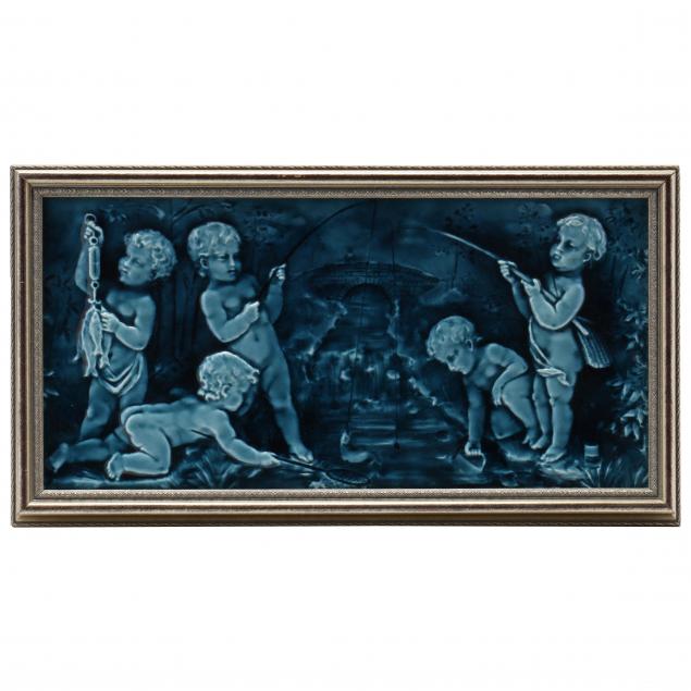 Late 19th century, glazed ceramic tile plaques, all appear unmarked, the largest two depicting putti within a library (10 3/4 x 19 7/8 in. framed) and of putti fishing (10 1/2 x 19 1/2 in. framed), both presented in uniform contemporary silver gilt frames; the smaller two depicting putti preparing an outdoor meal (7 3/4 x 13 3/4 in. framed) and returning from a hunt (7 3/4 x 13 5/8 in. framed), presented in uniform contemporary ebonized wood frames.