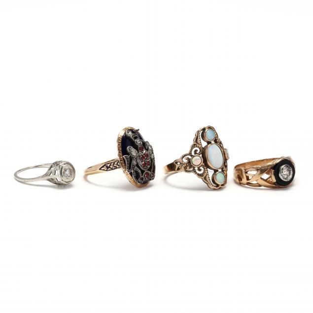 To include a ring of oval form with blue ground and with an applied white gold Royal Coat of Arms of Great Britain accented with old rose cut diamonds and red stones and with enamel detailing to shank, stamped 14K (19.4 x 14mm; ring size 6) (some diamonds with chips); a ring centering on an old European cut diamond weighing approximately .44 carat (L color. I2 clarity) with an onyx ground and with a criss cross shank, testing 14KT (6.75); a ring in white gold centering on a single cut round diamond accent and testing 14KT (ring size 5) (with worn, thin shank); a ring centering on a bezel set oval cabochon opal with bezel set round cabochon opals to the four points, set within an open scroll mount, stamped 375 for 9KT (19.5mm; ring size 6.25); and a pair of earrings in dangle form set with diamond melee accents suspending an oval cabochon opal drop, completed with posts and push backs, testing 14KT (1 in.)