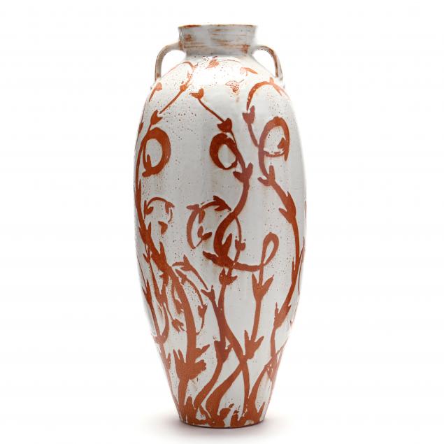 North Carolina, late 20th century, tapered form with wide collar and short applied strap handles, double glazed, the upper glaze layer scraped to create scrolling vines, impressed signature (illegible) and "N.C." on the underside.
