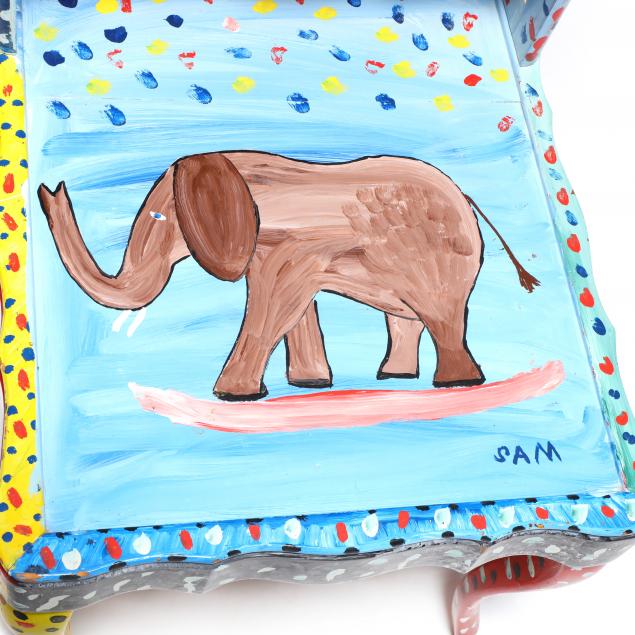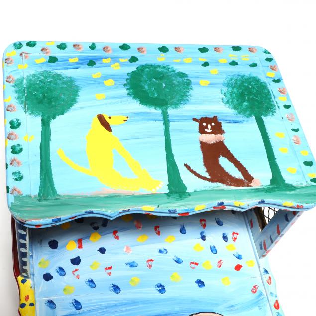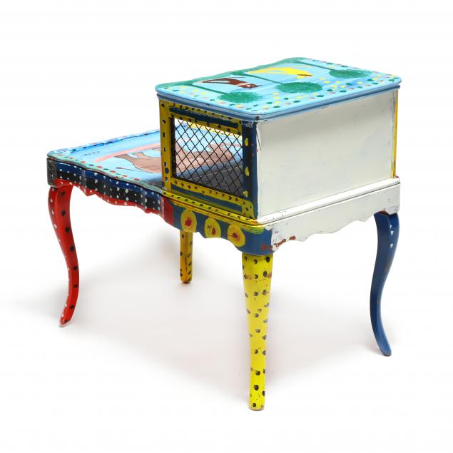 Two tier wooden table circa 1950s, wire mesh sides, cabriole legs, polychrome painted with animals surrounded by multi-colored dots, signed on the table surface "SAM."