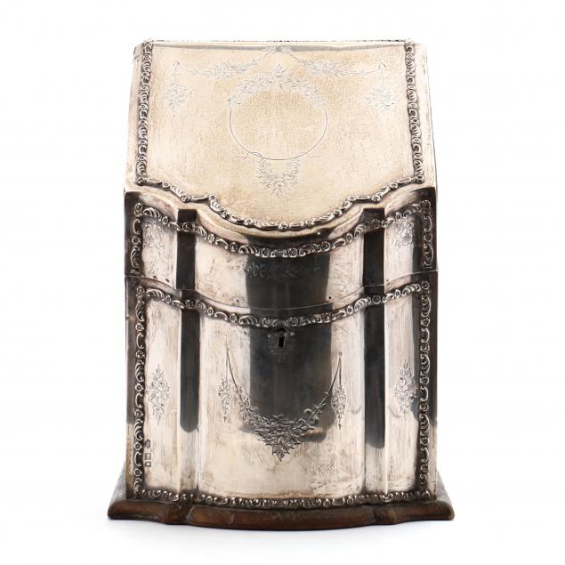 Mark of Goldsmiths & Silversmiths Co. Ltd., London (1905), sterling silver clad panels to slant lid and front, with embossed foliate and floral border designs and engraved oval cartouche without monogram, leather veneered sides and underside, opens to a divided interior with emerald green upholstery, on a flush base, includes key.
