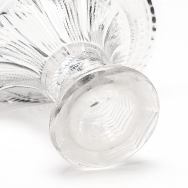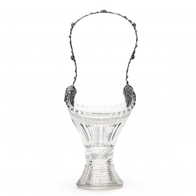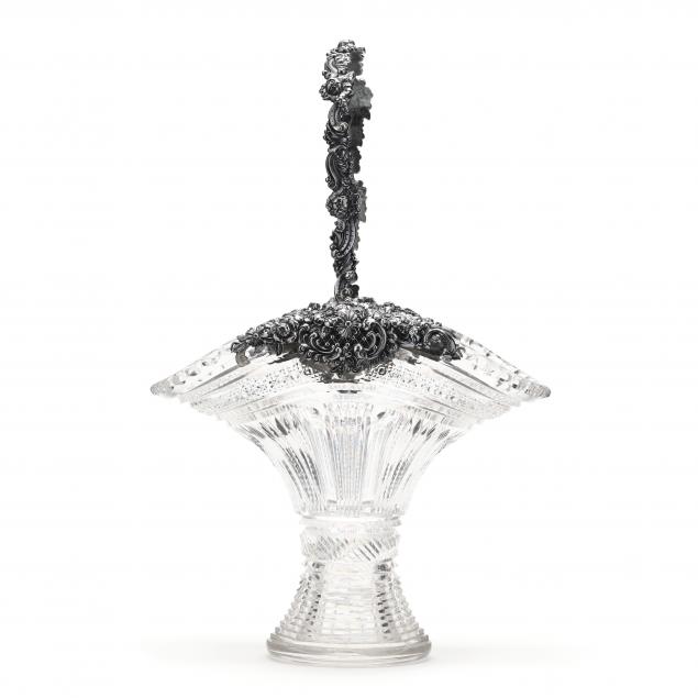 Circa 1902-1907 period hallmark, with fixed handle featuring chased and repousse floral and scroll design to exterior and engraved conforming design to interior, the handle affixed to the cut crystal basket with ornate floral and scroll mounts, no monograms.