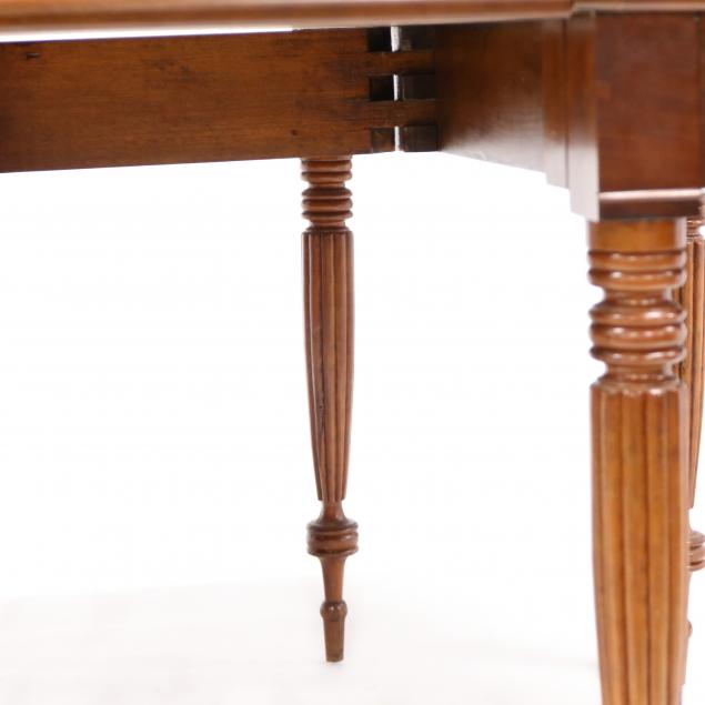 Circa 1820-40, mahogany veneer, poplar secondary, shaped top with drop leaves, gate-leg support, mahogany veneered skirt raised on bold turned and reeded legs with fine turned foot, with a custom leaf.
