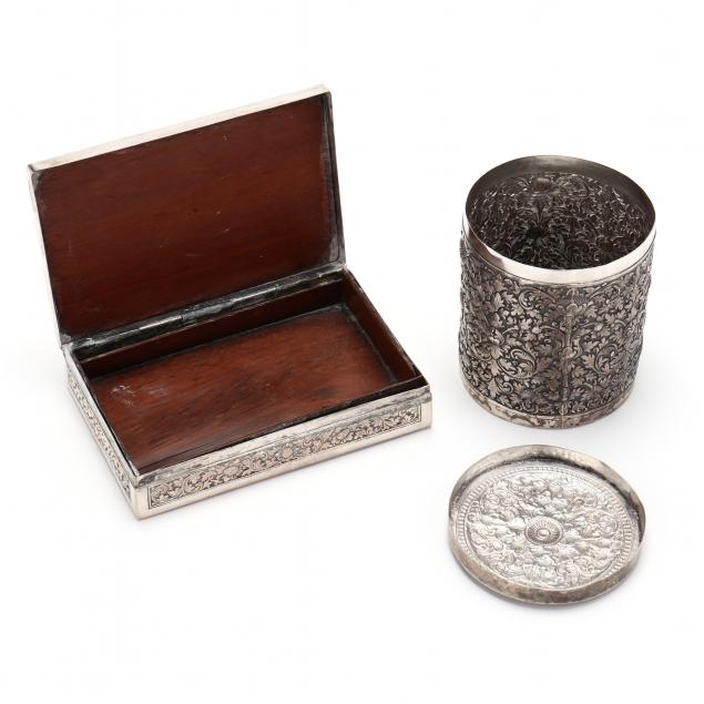 Both with elaborate foliate patterned repoussé decoration, the cigarette box marked .850 silver to underside, with wood lined interior (1 1/2 x 4 1/2 x 3 1/8 in.); the cylindrical tea caddy with fitted lid, appears unmarked (3 1/4 x 2 3/4 in.).