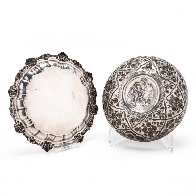 First a Spanish silver tray, unknown maker's mark with accompanying pentagram .915 minimum silver purity mark,(5 7/8 in.) (some scratches); next a hand-hammered repoussé silver bowl, appears unmarked but tested silver, with floral designs around a convex center with Byzantium double headed eagle coat of arms (1 1/2 x 5 in.) (some light scratches and small areas verdigris).
