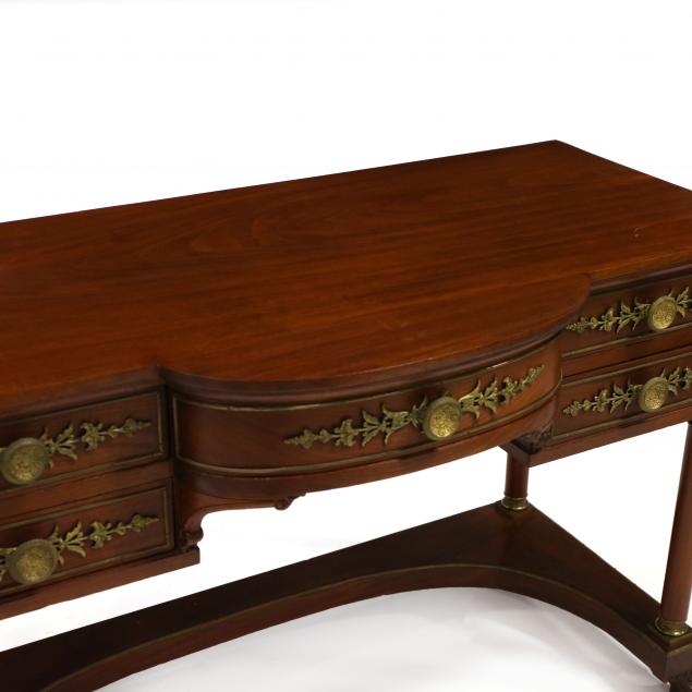 Early 20th century, oak secondary, rectangular top with projecting front panel, the case with five drawers featuring ormolu mounts, turned column supports, shaped stretcher with ormolu trim on carved paw feet.