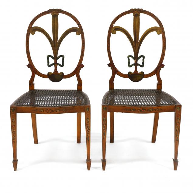 First half 20th century, pierced and painted back featuring Prince of Wales plume, serpentine cane seat, front square tapered legs with painted floral decoration on spade feet.