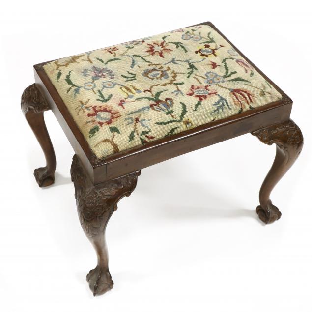 Circa 1900, needlepoint slip seat, seat rail with floral carved corners, cabriole legs with floral relief carvings on ball and claw feet.