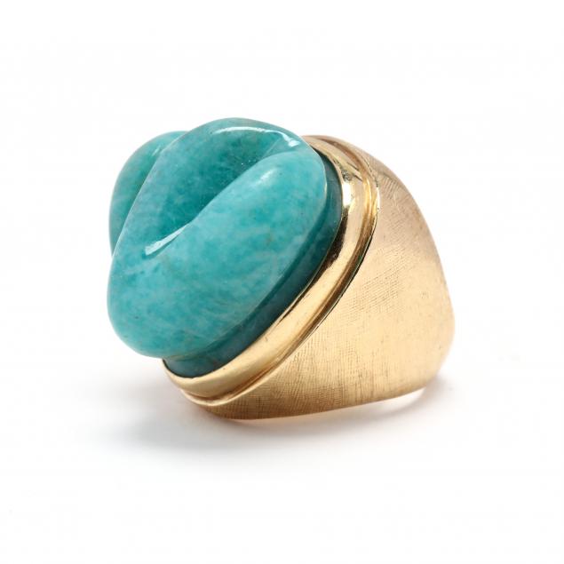 Centered on a free-form "forma live" carved amazonite set on a brushed gold tapering band, stamped NDBKGS / GG / 791, 750, and with maker's mark.