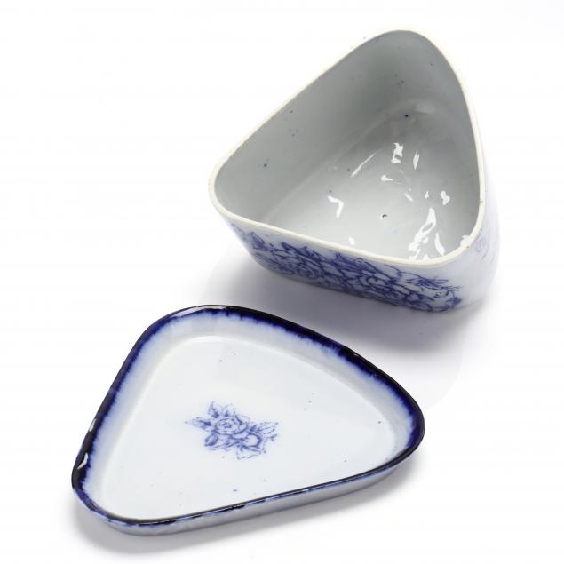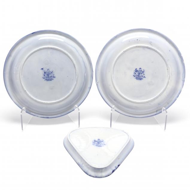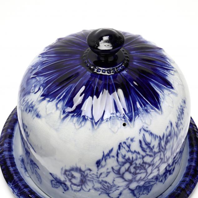 19th century, blue and white, two Stilton domes with under trays ( DOA 9 x 11 1/2 in.) and a wedge with under tray (7 x 8 1/2 in.).