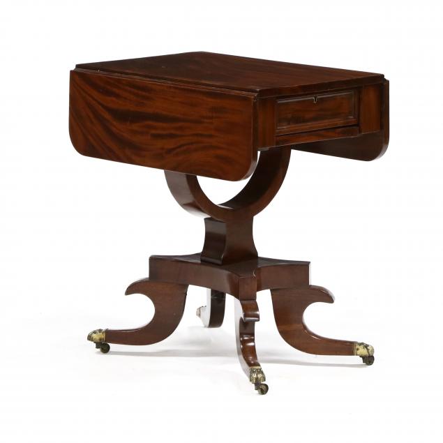 Circa 1830, mahogany veneer, white pine and mixed woods secondary, rectangular top, drop leaves with double butterfly support, both ends with one paneled drawer with divided interior, lower basket slide (lacking basket), quadruped base with cut legs, brass feet on casters.