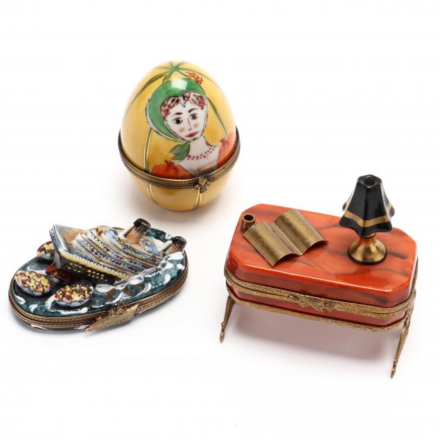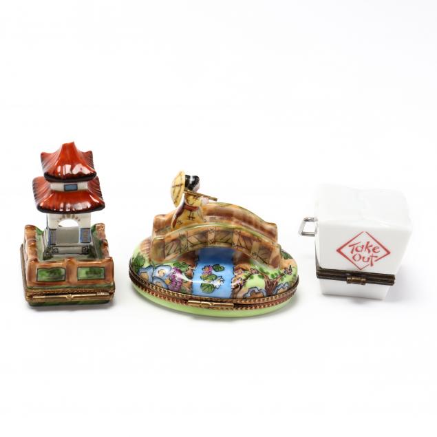 Limoges: two with Asian theme, pagoda and bridge; a caged bird (3 in.); a sinking ship; an egg which opens to a miniature dressing table top (3 in.) a swan; a writing desk (3 1/4 x 2 3/4 in.); PHB: Chinese take-out with fortune cookie.