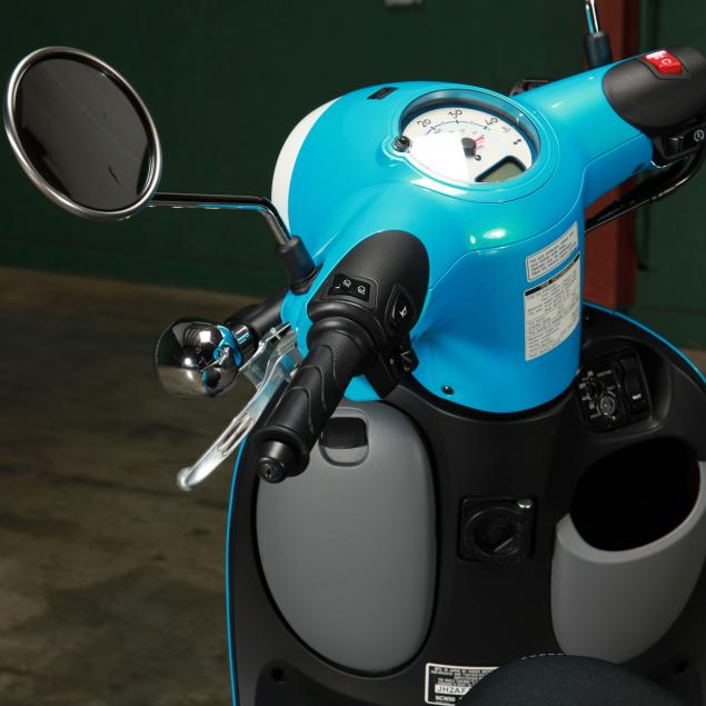 Equipped with a 49cc liquid-cooled single-cylinder four-stroke engine plus automatic V-matic transmission and belt drive; can be started electronically or by kick; front and rear brakes are drum style; independent front and rear suspension.