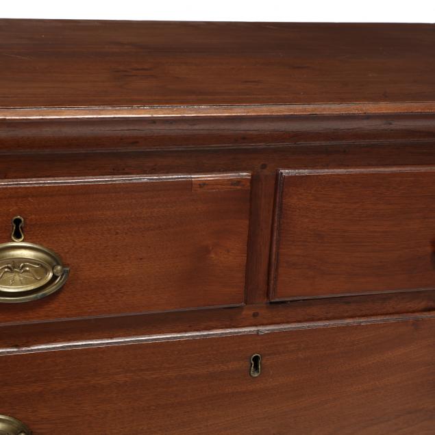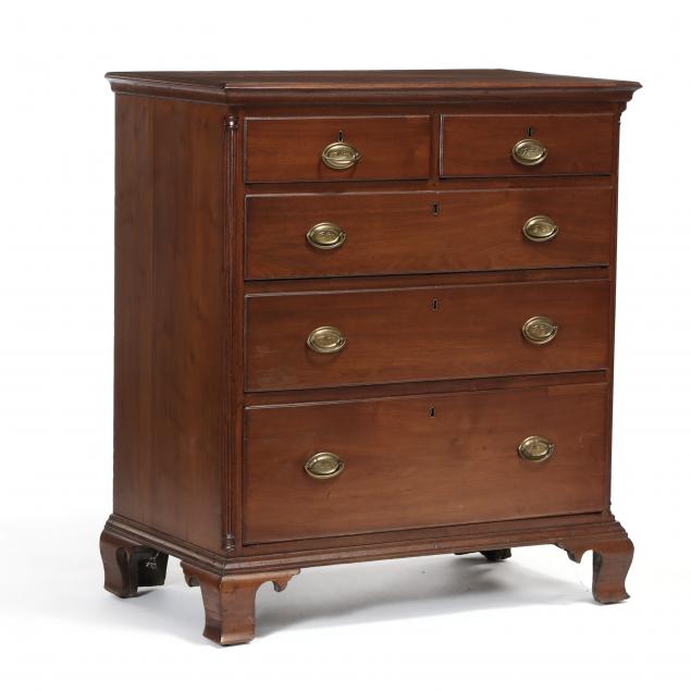 Western region, North Carolina, circa 1800, poplar and white pine secondary, dovetailed case, rectangular top with applied molding, two over three graduated lipped drawers, flanked by fluted quarter columns, ogee bracket foot facings with spur, feet formed from the straight solid.
