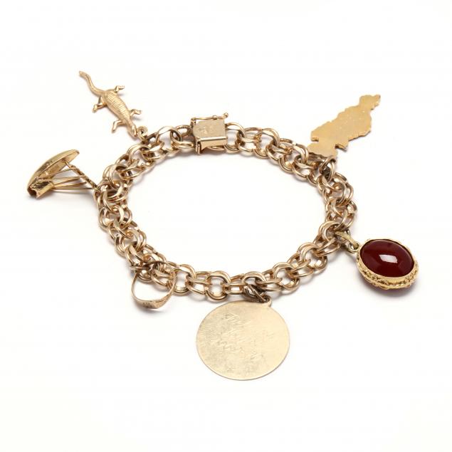 The gold round double link bracelet with six charms including a lizard stamped 750 to bail (1.25 in.); Bangladeshi sailboat stamped 14K 585 (.75 in.); a child's ring with monogram stamped DB 10K; a medallion engraved "Fielding / Hight / 1969-70 to obverse, the reverse engraved "Ideal / Thornwood / Girl", stamped 14K (1 in.); a bezel set cabochon carnelian, bail stamped 750 (.75 in.); and a gold-tone enameled outline of Kyoto (1 1/8 in.), completed with an integrated clasp stamped 14K and with patent number.