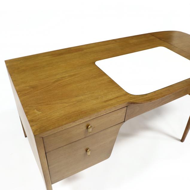 1960s, walnut veneer, shaped top with inset white laminate writing surface, right side with drop leaf having a slide support, one long flush drawer beside two drawers with original metal pulls on square tapered legs, labeled.