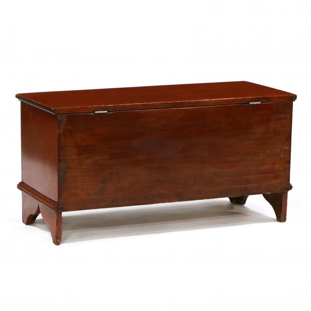 19th century, white pine and poplar, late red lacquer, hinged lid with applied molded edge, interior with lidded till, applied molded base trim on shaped bracket feet with central drop.