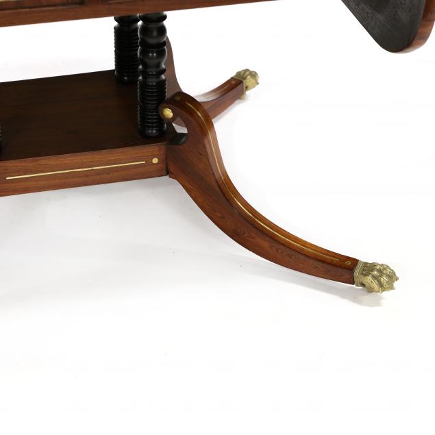 Circa 1815, kingwood veneer, brass inlay, oak secondary, top with book-matched veneers, drop leaves with double-butterfly support, the front with two banded cock beaded drawers, the verso with two faux drawers, raised on four ring turned and ebonized supports, quadruped base with scrolled knees and down-swept legs with brass paw feet on casters, the whole with brass line inlays.