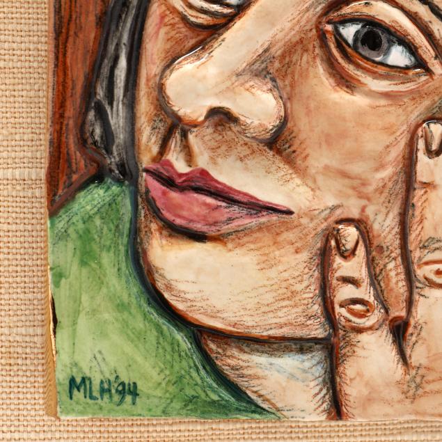 Two tiles, initialed and date '94, one matted and framed (tile 4 x 4 in.); two figures, signed and dated (taller 9 3/4 in.) and a hollow ball with a quatrefoil of molded faces, signed and dated 1993.