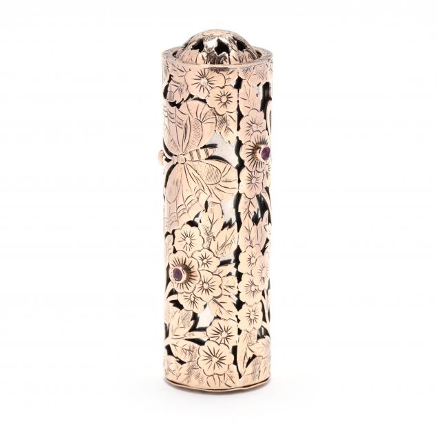 The openwork case with engraved butterfly and floral motifs, with five collet set round cut rubies, stamped Boucheron Paris BT No. 875012, interior silver case with French guarantee marks and numbered 60.507