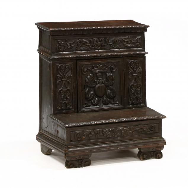 Late 17th to early 18th century, pine and mixed woods, recessed upper cabinet, with a hinged top, above a hinged cabinet door with relief carved crest, shelved interior, projecting lower front section with hinged lid to reveal an open compartment, upper and lower friezes and stiles with relief carved vine and leaf design, carved and scrolled front feet, gadrooned border to hinged lids, paneled sides.