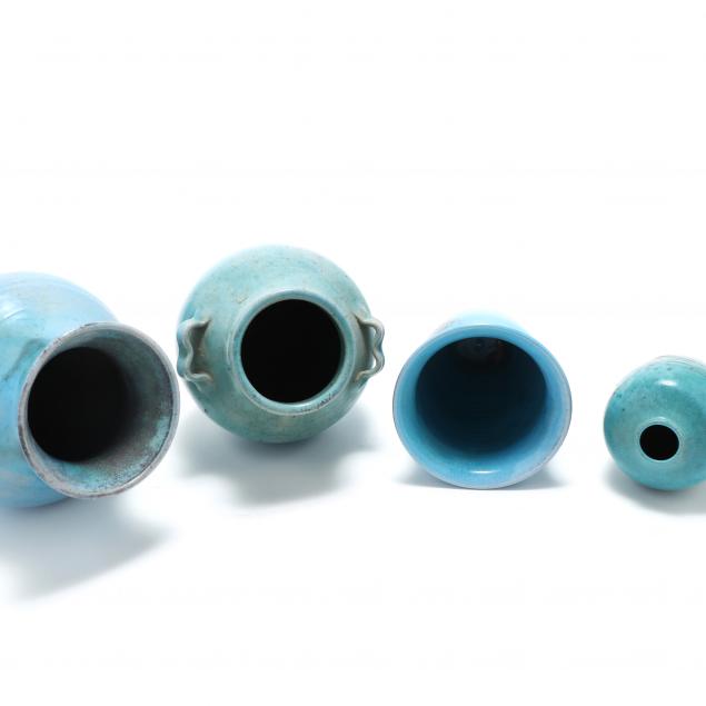 Wide mouth vase, signed and dated 1984, (9 1/2 in.); egg vase signed and dated 1995; a Han style vase stamped "Ben Owen Pottery Shop" (8 1/4 in.); a flared vase signed and dated 2003 (7 in.).