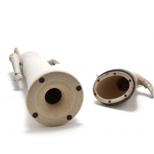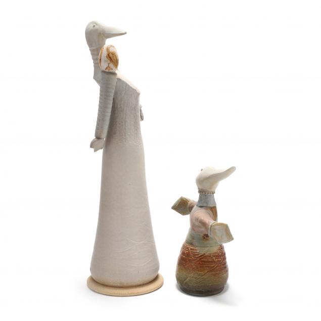 Stoneware with copper reduction and slip, each animal wearing a full length gown, note the 'egg' shoulders on the duck, signed on the interior "TS".