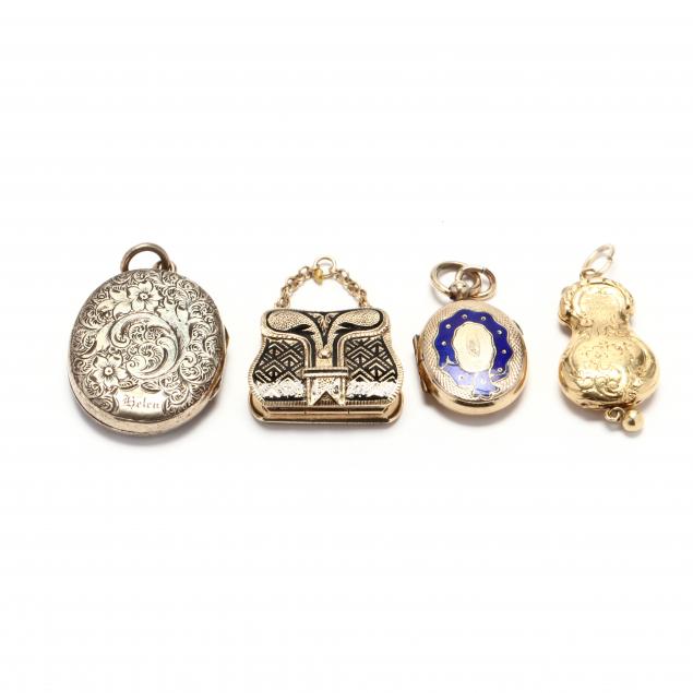 To include: a purse motif locket with black enamel decoration, interior with two apertures each holding a lock of hair, testing 14KT (5/8 x 13/16 in.); an oval locket with engine turned detailing and enamel decoration, verso engraved "Joseph", interior with two apertures, one containing a lock of hair and the other a photograph, testing 14KT (1 in.); an oval locket with repousse and enamel decoration, engraved "Helen", interior with two apertures, one containing a lock of hair and the other a photograph, testing 14KT (1.25 in.); and a vinaigrette pendant with repousse decoration, interior with scent compartment, testing 18KT (1.25 in.).
