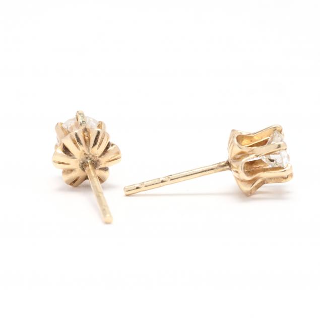 To include: a pair of white gold stud earrings with full cut round diamonds weighing approximately .92 total carat (I-J color, SI clarity), completed with posts and screw backs stamped 585; a pair of yellow gold stud earrings with full cut round diamonds weighing approximately .56 total carat (J-K color, I clarity), completed with posts and screw backs stamped 14K; and a pair of yellow gold studs with full cut round diamonds weighing approximately .56 total carat (H-I color, SI clarity) completed with posts (lacking push backs).