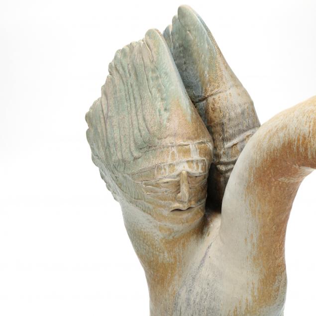 Glazed stoneware with carving and pale tints, a large goose with wings, the wings carved to resembling a Native American chief, inscribed on the underside "TS 92".