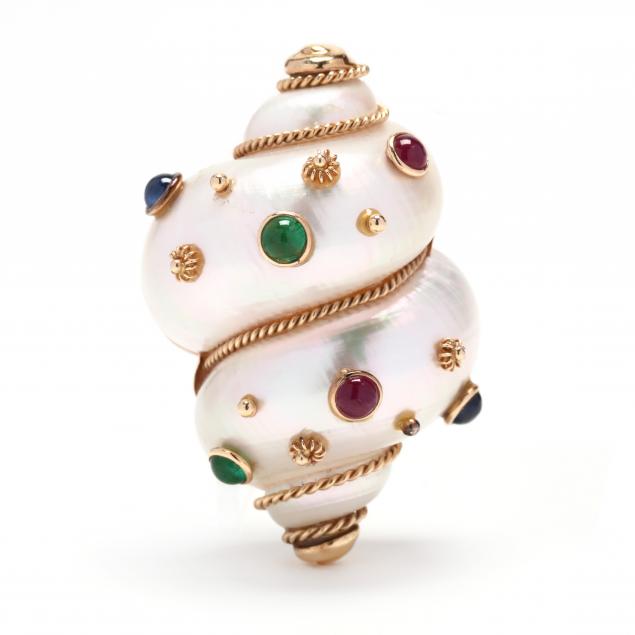 To include turbo shell brooch accented with bezel set round cabochon rubies, emeralds, and sapphires and with gold wire twist and rosette accents and gold bead end caps, completed with single locking pin stem, signed and stamped 14K (1.5 x 2.5 in.); ear clips en suite and completed with omega clip backs, signed and stamped 14K (1.5 x 1 in.).