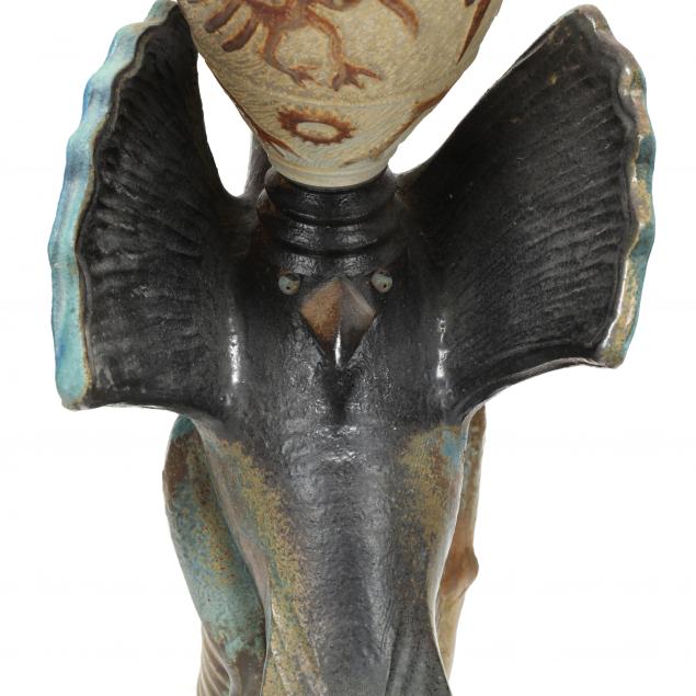Glazed ceramic with colored elements, a tall bird carries a reverse facing bird on its back as well as a flower pot, signed on the underside.