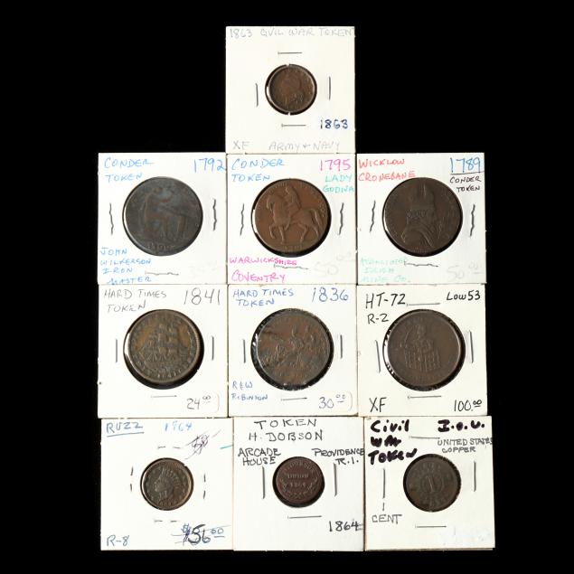 All with original brown patinas, to include: 1789 Conder Token, Wicklow, Ireland and honoring the "Associated Irish Mine Company"; 1792 Conder Token honoring "John Wilkerson, Iron Master"; 1795 Conder Token called a "Coventry Halfpenny" with Lady Godiva on the obverse; plus...Three (3) American Hard Times tokens, being "American Institute New York" advertising button maker R & W Robinson; the derisive Andrew Jackson "I TAKE THE RESPONSIBILITY" token; an 1841 token vowing "MILLIONS FOR DEFENSE / NOT A CENT FOT TRIBUTE"; plus four northern Civil War tokens being "UNITED STATES COPPER," "OUR ARMY," "ARMY AND NAVY," and "UNION 1864."