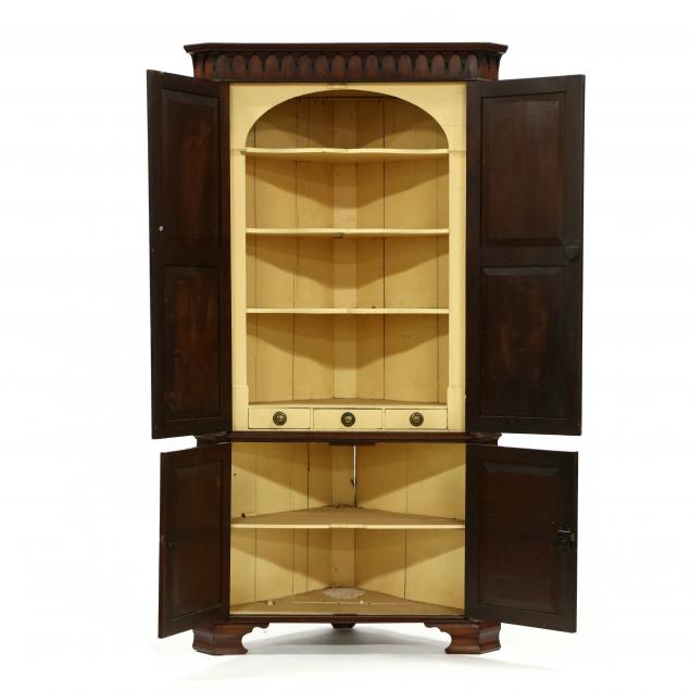 Late 18th century, pine secondary, two part form, applied cornice with, the frieze with arched motif and applied drop, two upper hinged doors each with double panel featuring a molded interior edge, interior with shaped butterfly shelves the bottom shelf with three side-by-side small drawers, the base with applied waist molding, two paneled lower cabinet doors, ogee bracket feet facings.